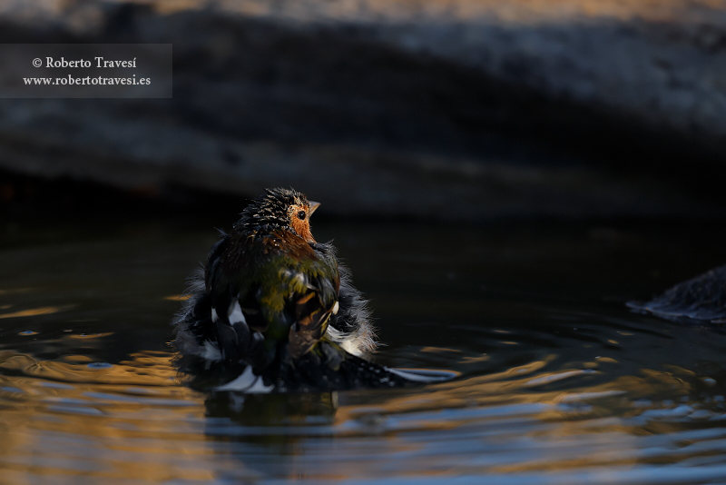 Male chaffinch (Fringilla coelebs) during an early morning swim in the Marquesado del Zenete (September 2021).